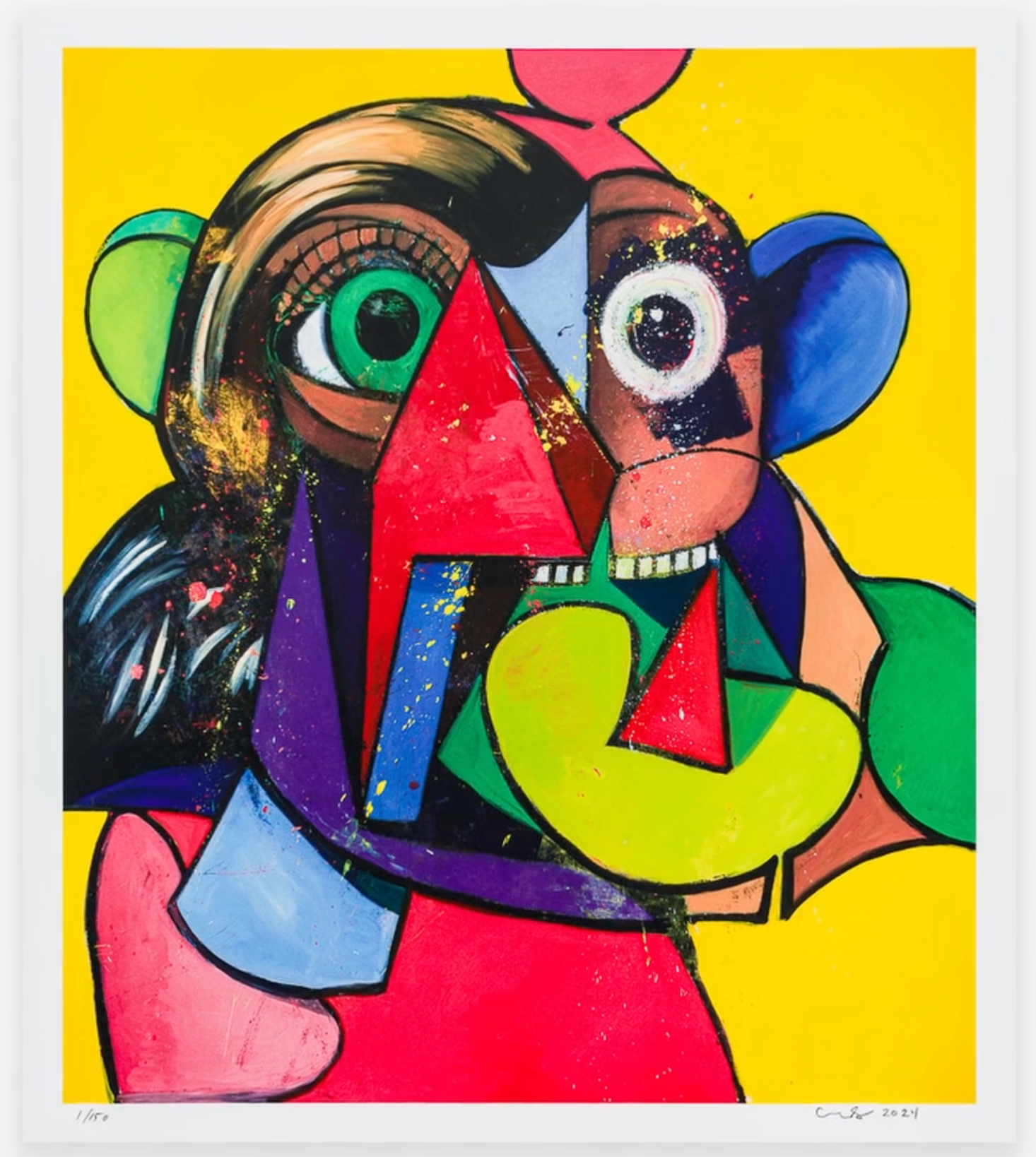 This striking composition exemplifies Condo’s instantly recognizable visual language — a sophisticated fusion of fractured Cubist structure, psychological portraiture, and post-modern satire that the artist famously defines as Artificial Realism. The work occupies the charged space between abstraction and figuration, where emotion, humor, and unease coexist in perfect tension.